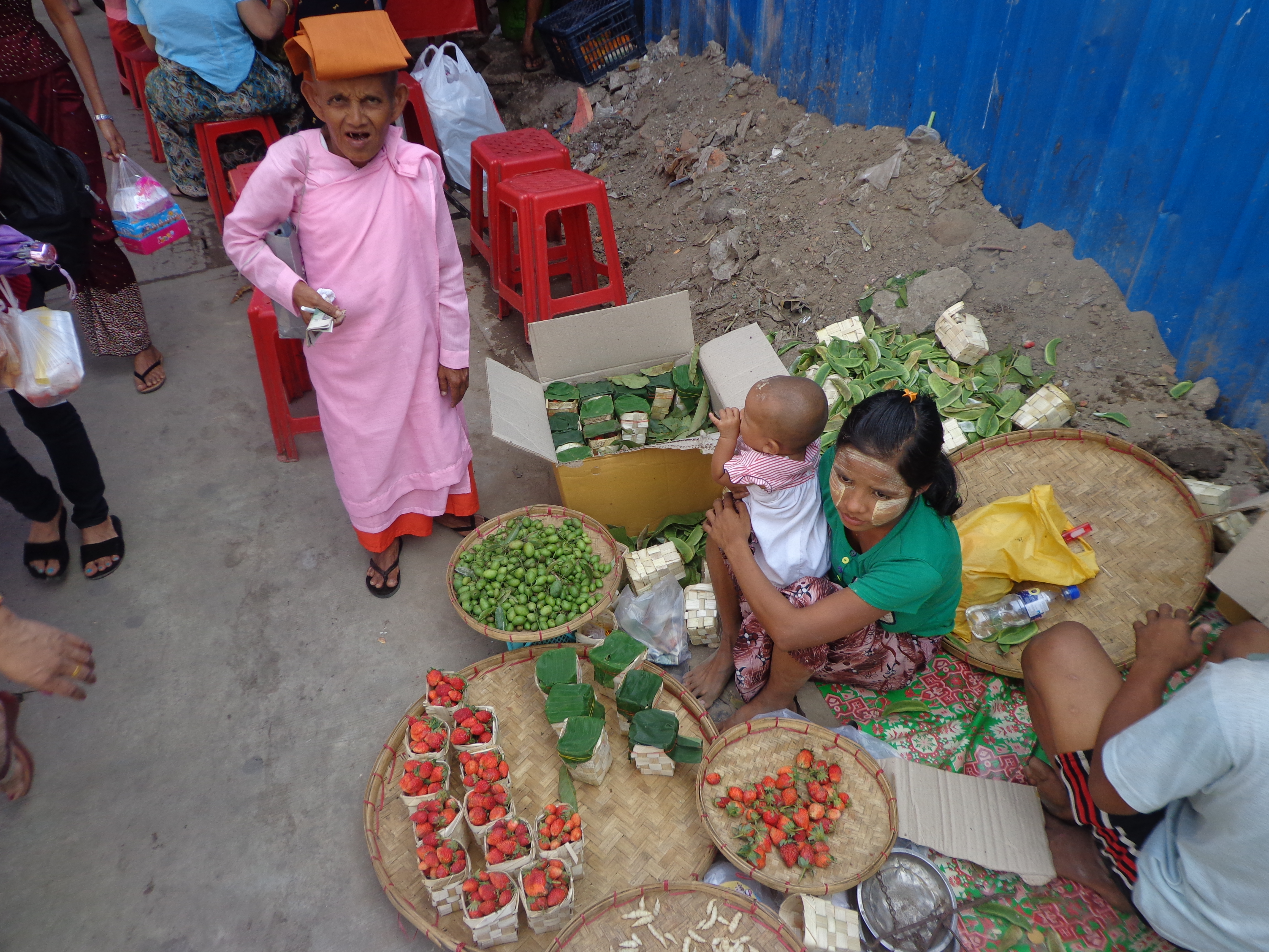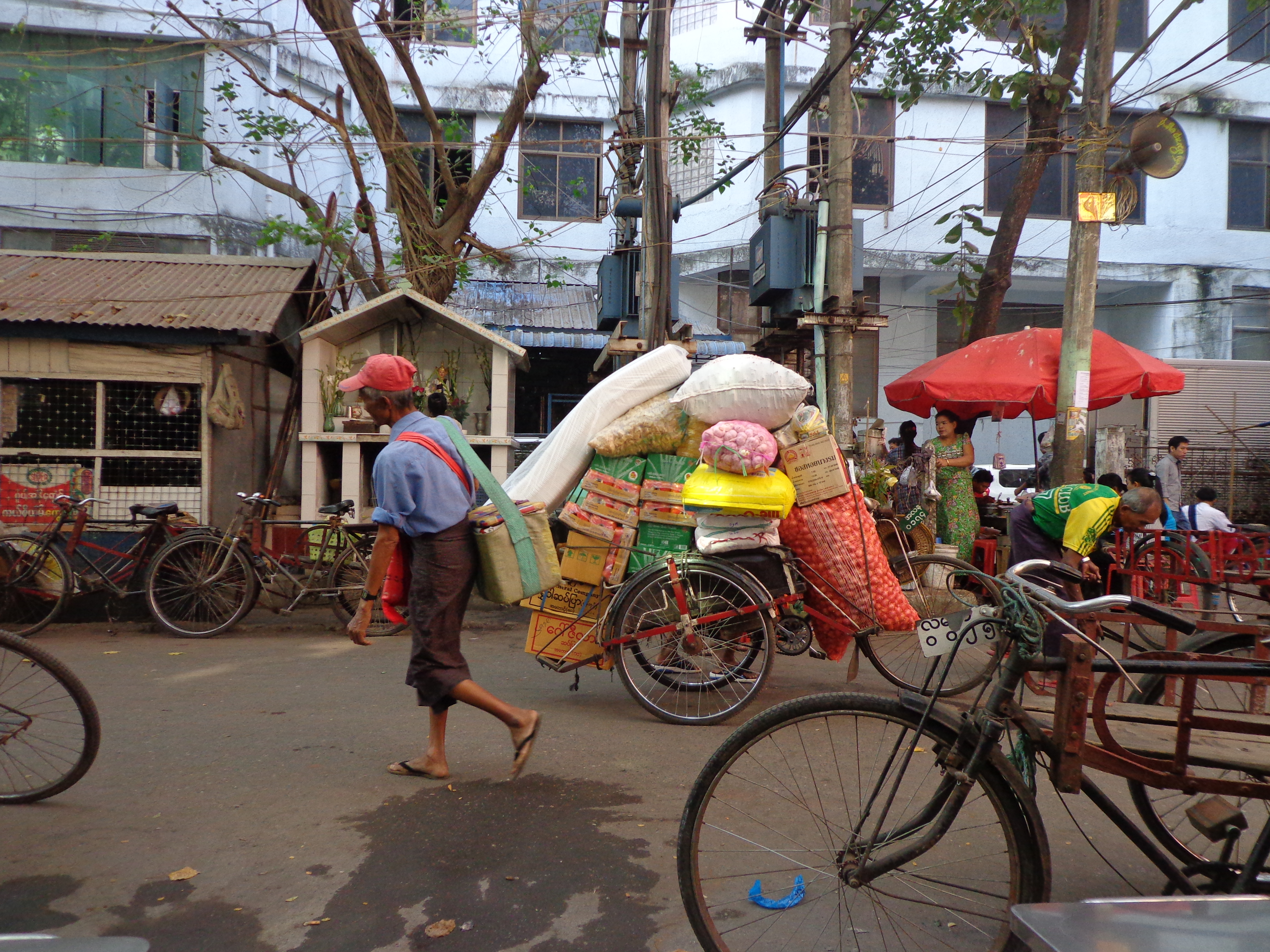 De stad is niet bij te benen. Hij raast voorbij en laat onverwerkte indrukken achter: een werveling van bedrijvigheid die over de straten waaiert. Mannen fluimen op de keien. Sissend worden gerechten opgediend. De rook van houtvuur slaat op de luchtwegen. Van de Birmezen kookt 90 procent op houtvuur. Weinig beschikken er over elektriciteit. De meeste panden stapelen de armoede etages hoog op. De gevels zijn zwart geblakerd. Het Birmees-Frans stel waar we te gast zijn vertelt dat de tandarts voor de gewone Birmees onbetaalbaar is. Er zijn verschillende klassen en tarieven. Een bezoek aan de tandarts kost een half maandsalaris. De oplossing ligt in de vitrine van een uitstalkast op een overdekte markt die we even later bezoeken: tandartsinstrumenten en ander medisch instrumentarium. Te vinden tussen de uitgestalde kleding en schoonheidsproducten. Voor een spotprijs! We doorkruisen straten met verkopers van enorme voorraden opgestapeld gereedschap. Iedere handelaar zijn specialiteit. We zien er één met honderden tweedehands boormachines, gestript en gedemonteerd en weer opnieuw geassembleerd: mensen hebben nog een relatie met wat ze verkopen. Weten hoe het in elkaar zit.