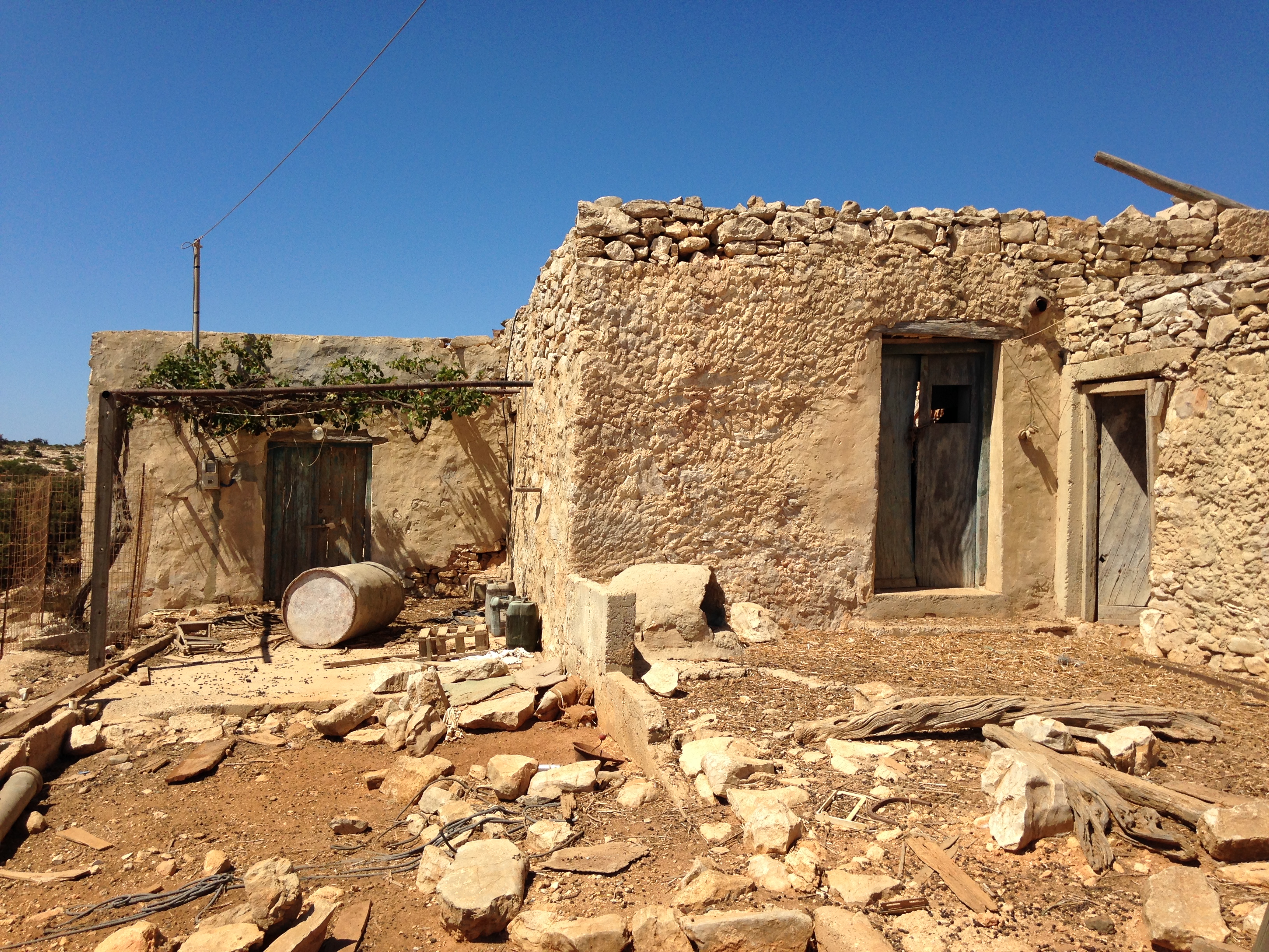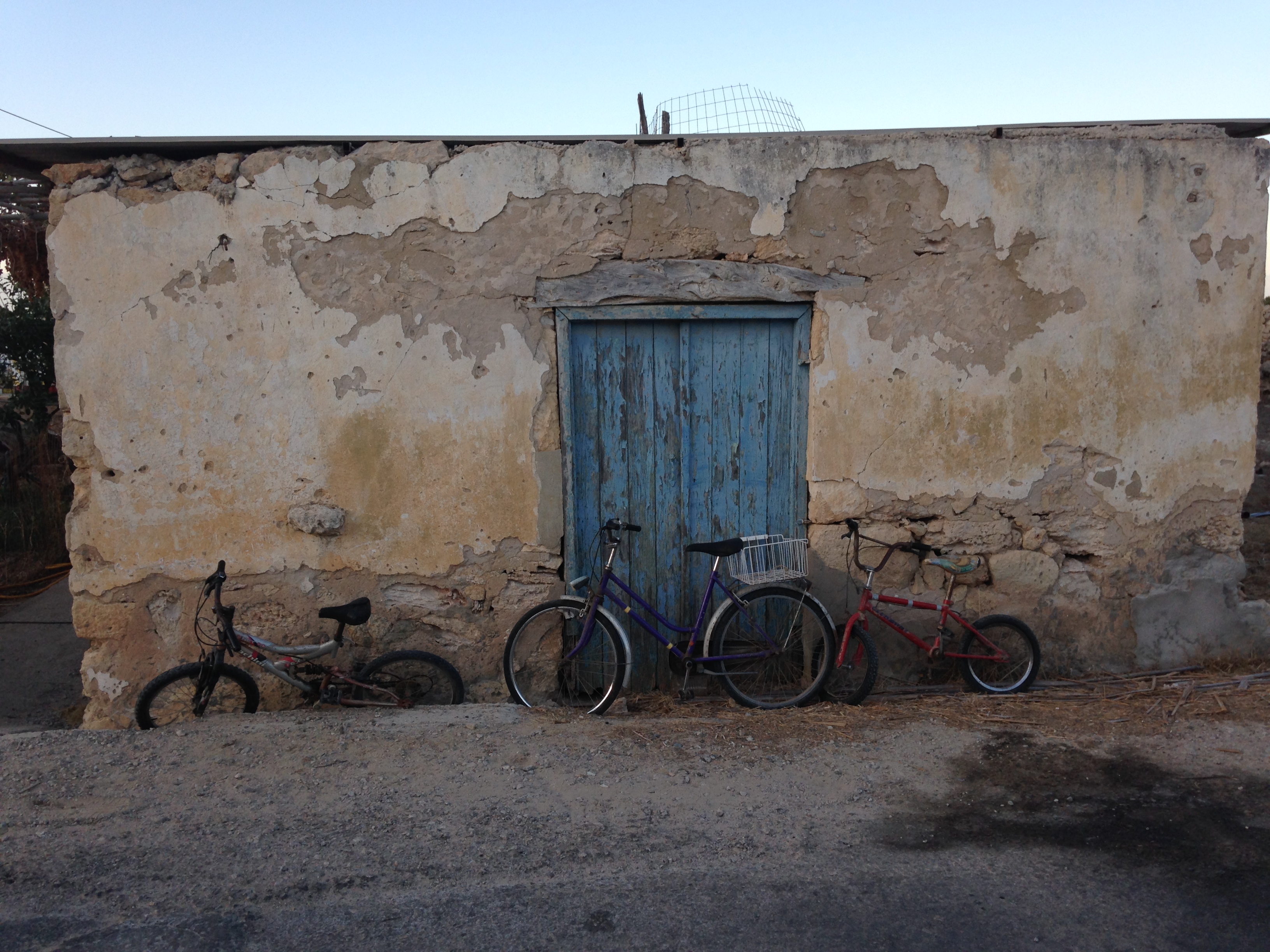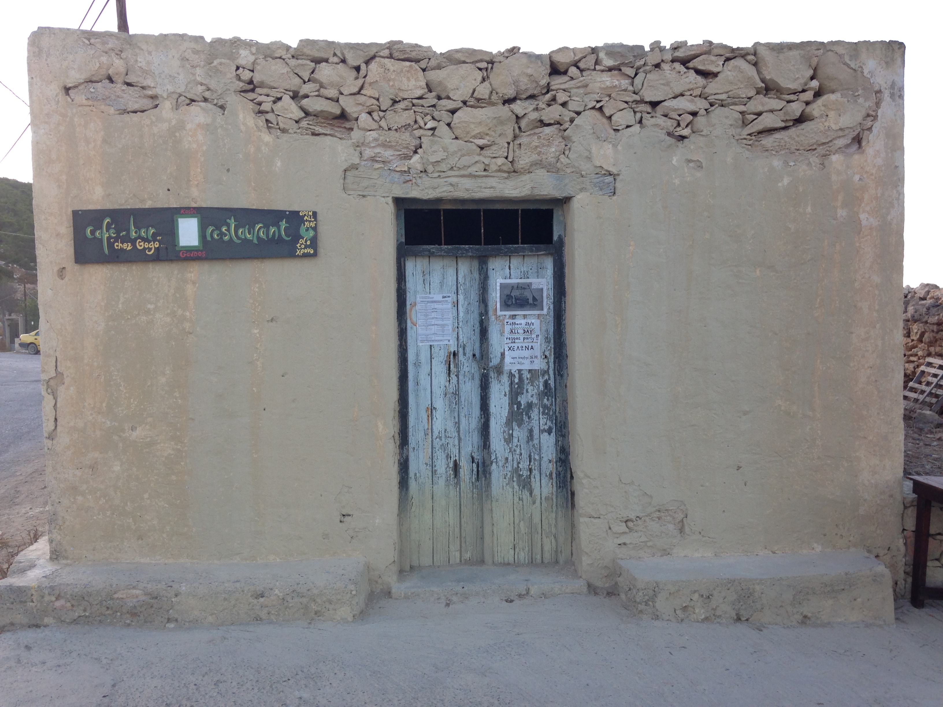 Gavdos is puur en desolaat, doet bizar aan en werkt op de lachspieren. Aan de einder vloeit de kleur van het zeewater samen met die van de lucht. De aarde is dor, bezaaid met stof, gruis en keien. Alleen naaldbomen gedijen er. De verhuurder van ons appartement, een Georgiër, lacht als wij hem vragen naar de verzekeringsvoorwaarden van de huur van één van zijn twee auto’s: “Gavdos, no problem!” laat hij weten en overhandigt zonder papierwerk of rijbewijs, de autosleutel. Bij het hoger gelegen Vadsianos, een kruising op een heuvel met een kapel en enkele povere huisjes, leggen we aan en maken foto’s van een in onbruik geraakte tractor, die onder een struik lijkt de poseren in het landschap. Een oudere gebruinde man, eigenaar van het terrein, komt lachend naar ons toe. Hij wijst richting het Afrikaanse continent en roept; “Gadafi!”en vervolgens naar de andere kant: “Italy, mafia, photo?.” Als de man hoort dat we bij Consolas huren, toept hij; “capitalista!” Consolas beschikt over meerdere appartementen op het nabijgelegen Kreta. “Raki?” even later zitten we aan tafel op het terras van zijn woning. Bedreven laat hij een anderhalve literfles raki rondgaan. Plotseling loopt hij weg en komt terug met een lam in zijn arm, dat hij bij Dais in de schoot legt. Bij het ontbijt van Consolas vanochtend ontmoetten we een Brits ouder stel. Hij schrijver, bekend in eigen land, en zij bekend feministe en actief voor de OVSE. Zij bereidt haar reis naar Soedan voor. Hij schrijft net als vorig jaar een boek op Gavdos. Beiden zijn verhalenvertellers. Ze maken van de ontbijtruimte een theaterzaal.De overheid is volledig afwezig op het eiland. Een eenzame agent, die zijn wagen meestal aan het strand heeft staan, verleent hand- en spandiensten aan een taverne. Drukte ontbreekt, maar binnen enkele jaren zullen ook hier de affiches van Tripadvisor hun intrede doen. Een krekel weet van geen ophouden en ratelt en rinkelt er op los, laat zich door de kracht van de zon niet weerhouden. Intussen is er geen leven op het eiland. Iedereen is landerig of afwezig.